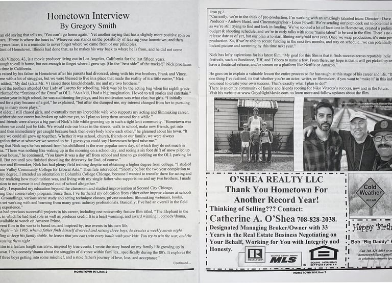 Guys Night was featured in the January 2022 issue of the Hometown Hi-Lites, a local publication distributed in and around the community of Hometown, Illinois where we plan to shoot 100% of the movie. The interview with screenwriter/producer Niko Vitacco is the featured article and comprises 2 full pages inside the newsletter.