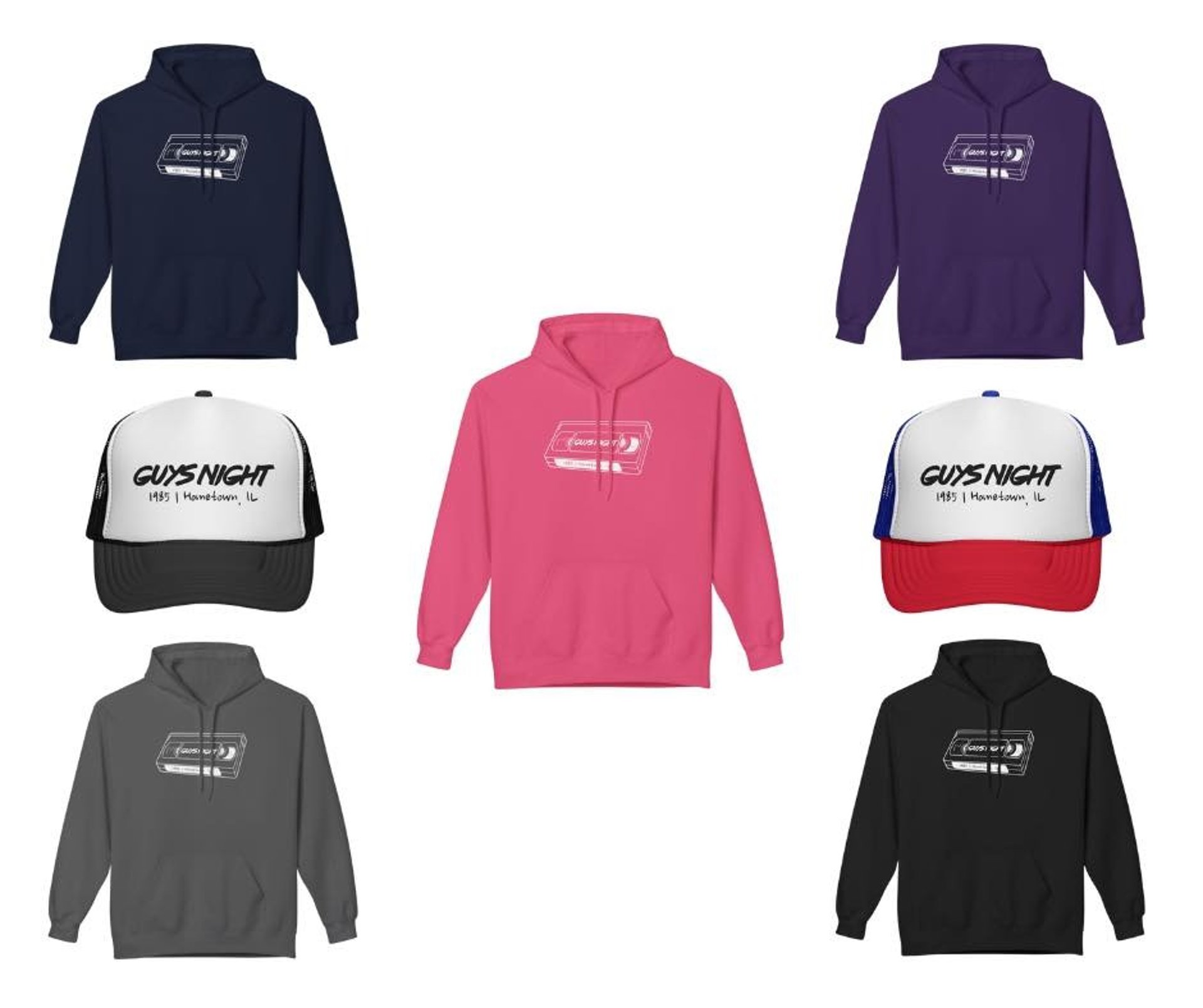 Our exclusive Guys Night merch was created to celebrate 1985 nostalgia, fatherhood, and the spirit of Hometown, IL.